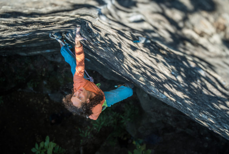 In this one, you have to do about fifteen very powerful moves on small holds, then follow with the stamina top part with the dynos. The first section is hard to execute, especially with two magnificent and rare undercling moves that can quickly skip the power endurance you need for the final moves. It was a good mental fight in the dynos! You have to commit yourself 200% to these moves, and there’s one thing: when you’ve already succeeded in this kind of dynamic move, it’s hard to do it perfectly another time, you can quickly psych yourself out, miss holds because you’re stressed or whatever…